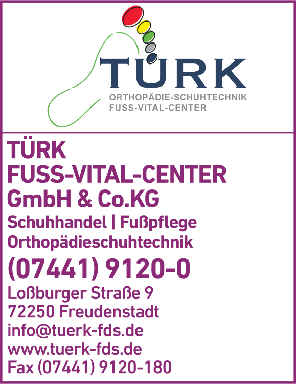 Die Adresse von Türk Fuß-Vital-Center GmbH & Co.KG lautet: Loßburger Str. 9, 72250 Freudenstadt