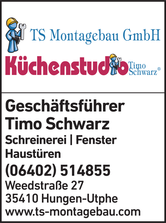 Die Adresse von TS Montagebau GmbH Timo Schwarz lautet: Weedstr. 27, 35410 Hungen
