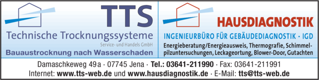 TTS Technische Trocknungssysteme Service u. Handels GmbH* bietet Technische Trocknungssysteme, Bauaustrocknung nach Wasserschaden, Ingenieurbüro, Gebäudediagnostik, IGD, Hausdiagnostik, Energieberatung, Energieausweis, Thermografie und Schimmelpilzuntersuchungen an.
