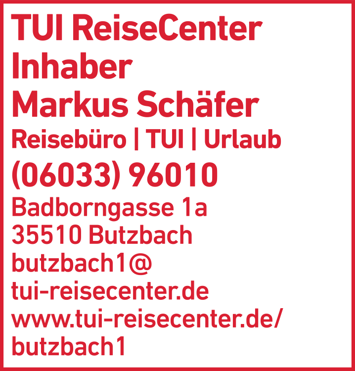 Die Adresse von TUI ReiseCenter Inh. Markus Schäfer Reisebüro lautet: Badborngasse 1 a, 35510 Butzbach