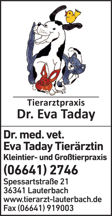 Die Adresse von Taday Eva Dr. Tierarztpraxis lautet: Spessartstr. 21, 36341 Lauterbach