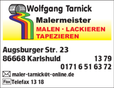 Die Adresse von Tarnick Malermeister lautet: Augsburger Str. 23, 86668 Karlshuld