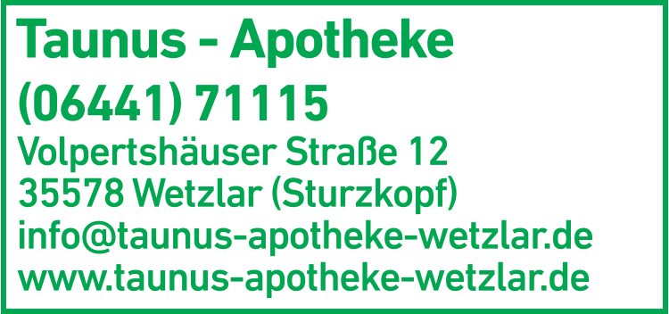 Die Adresse von Taunus Apotheke lautet: Volpertshäuser Str. 12, 35578 Wetzlar
