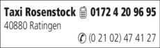 Die Adresse von Taxi Rosenstock lautet: 40880 Ratingen