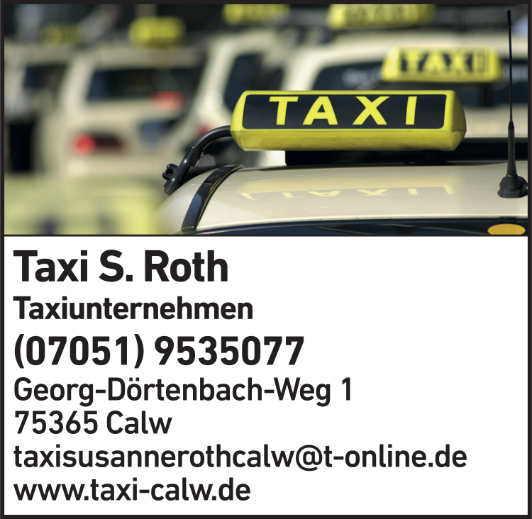 Die Adresse von Taxi S. Roth lautet: Georg-Dörtenbach-Weg 1, 75365 Calw
