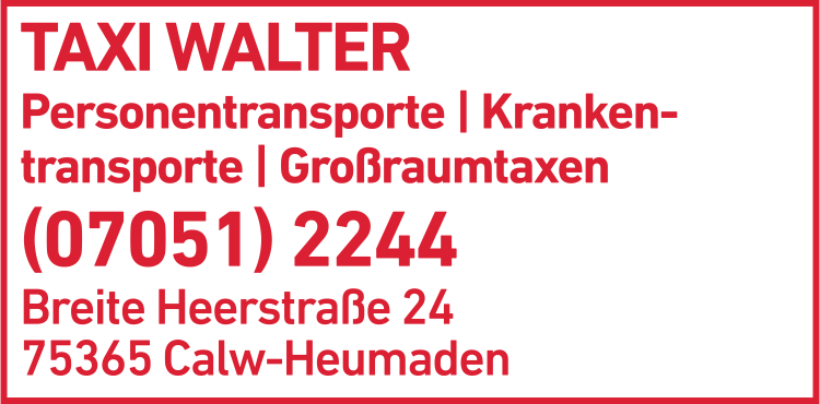 Die Adresse von Taxi Walter lautet: Breite Heerstr. 24, 75365 Calw