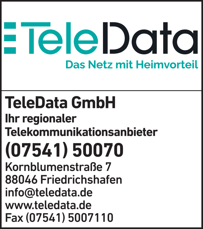 Die Adresse von TeleData GmbH lautet: Kornblumenstr. 7, 88046 Friedrichshafen