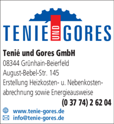 Die Adresse von Tenié und Gores GmbH lautet: August-Bebel-Str. 145, 08344 Grünhain-Beierfeld