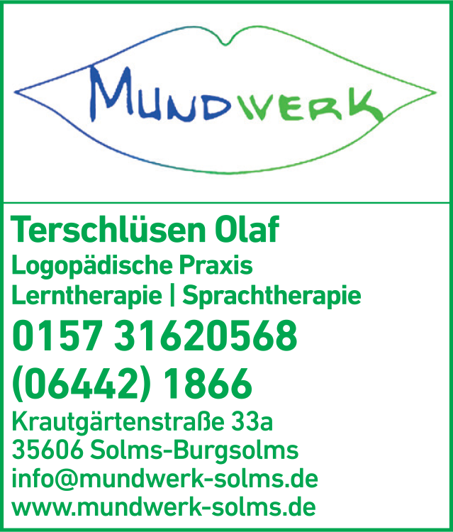 Die Adresse von Terschlüsen Olaf Praxis für Logopädie lautet: Kräutergartenstr. 33 a, 35606 Solms-Burgsolms