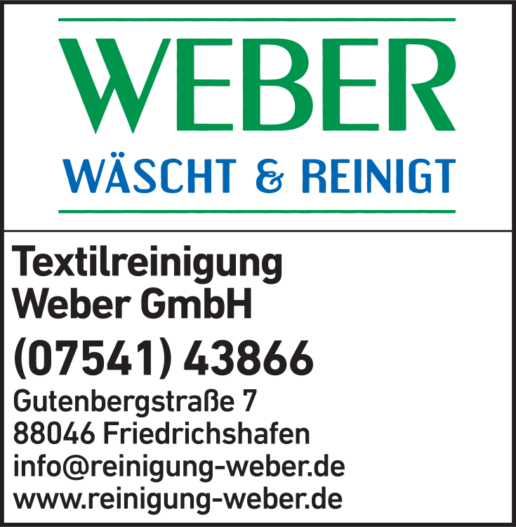 Die Adresse von Textilreinigung Weber GmbH lautet: Gutenbergstr. 7, 88046 Friedrichshafen