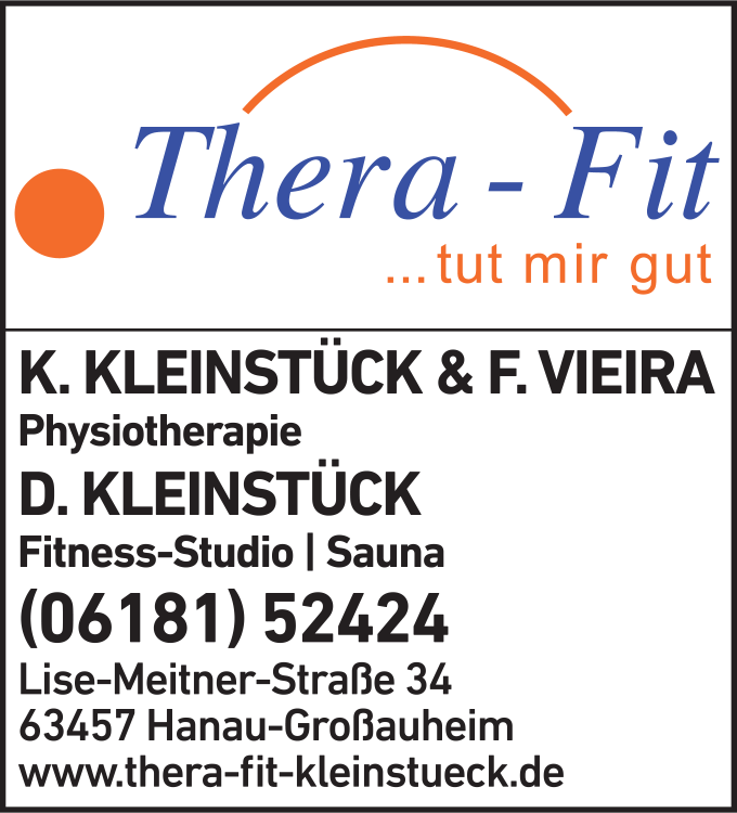 Die Adresse von Thera-Fit, Inh. Karsten Kleinstück & Fernando Vieira Physiotherapie und Dagmar Kleinstück Fitness-Studio lautet: Lise-Meitner-Str. 34, 63457 Hanau