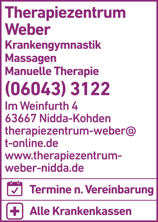 Die Adresse von Therapiezentrum Weber Massage und Krankengymnastik lautet: Im Weinfurth 4, 63667 Nidda-Kohden