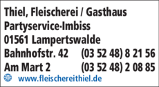 Wenn Sie Fleisch höchster Qualität genießen möchten, ist die Fleischerei Thiel GmbH in Lampertswalde ein idealer Ansprechpartner. Dieser gastronomische Anbieter macht ein leckeres Abendessen genauso problemlos möglich wie ausgelassene Familienfeiern. Der Imbiss des Betriebs hält große Gaumenfreuden für Sie bereit. Möchten Sie den Partyservice des Hauses Thiel nutzen, so stehen Ihnen die Spezialisten des Unternehmens vorab beratend zur Seite. Mögen Sie Wildspezialitäten von bester Güte, so sind Sie bei der Fleischerei Thiel GmbH an einer sehr guten Adresse. Natürlich haben die Gastronomieprofis auch Spanferkel für Sie im Programm. Mithilfe des Angebotes dieser Fleischerei können Sie selbst ausgesprochen anspruchsvolle kulinarische Ideen ganz mühelos umsetzen.