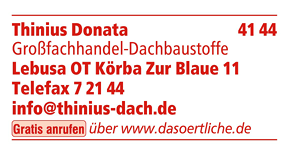 Die Adresse von Thinius Donata Großfachhandel-Dachbaustoffe lautet: Zur Blaue 11, 04936 Lebusa