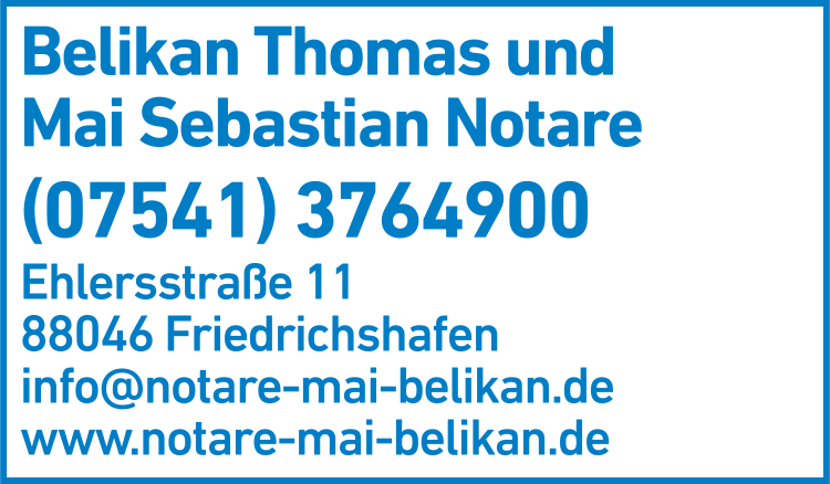 Die Adresse von Thomas Belikan und Sebastian Mai Notare lautet: Ehlersstr. 11, 88046 Friedrichshafen