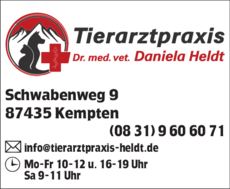 Die Adresse von Tierarztpraxis Heldt Daniela Dres.med.vet. Dres.med.vet. lautet: Schwabenweg 9, 87435 Kempten