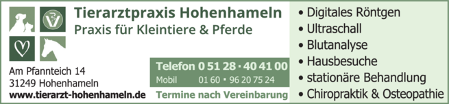 Tierarztpraxis Hohenhameln bietet digitales Röntgen, Ultraschall, Blutanalyse, Zahnheilkunde, Osteopathie, Akupunktur, Kleintiere, Großtiere, Kleintierpraxis und Großtierpraxis als Produkt(e) an