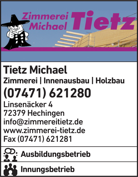 Die Adresse von Tietz Michael Zimmerei lautet: Linsenäcker 4, 72379 Hechingen
