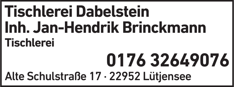 Die Adresse von Tischlerei Dabelstein lautet: Alte Schulstr. 17, 22952 Lütjensee