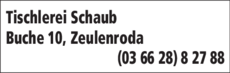 Die Adresse von Tischlerei Hans Schaub Inh. Ronald Schaub lautet: Buche 10, 07937 Zeulenroda