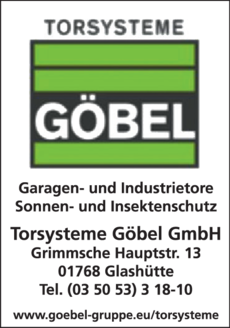 Torsysteme Göbel GmbH 035053 3 18-10 Glashütte Grimmsche Hauptstr. 13 01768 Reinhardtsgrimma https://ies.v4all.de/0122/OETB/0230/4/0434/70350434_200x100px.png 5 5 1
