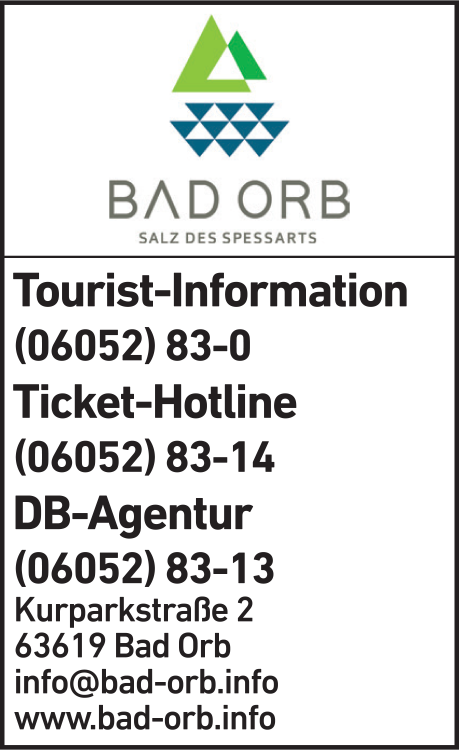 Die Adresse von Tourist-Info Bad Orb lautet: Kurparkstr. 2, 63619 Bad Orb