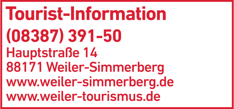 Die Adresse von Tourist-Information lautet: Hauptstr. 14, 88171 Weiler-Simmerberg