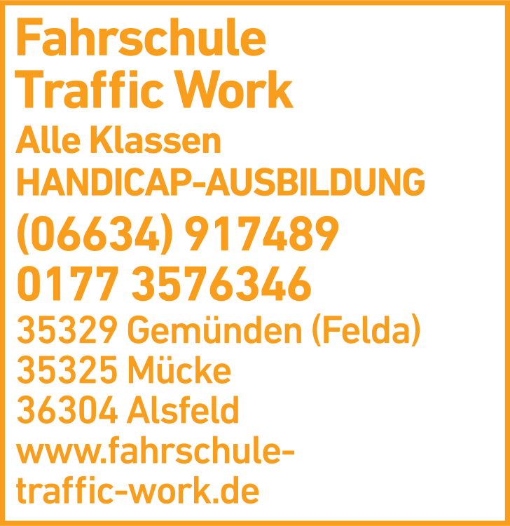 Die Adresse von Traffic Work Fahrschule lautet: Bernsfelder Str. 8, 35329 Gemünden (Felda)
