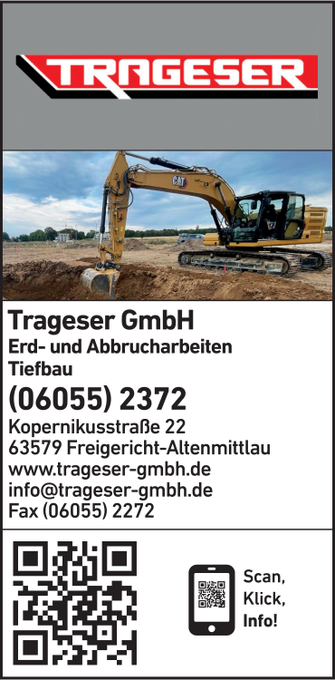 Die Adresse von Trageser GmbH Erd- und Abbrucharbeiten lautet: Kopernikusstr. 22, 63579 Freigericht-Altenmittlau