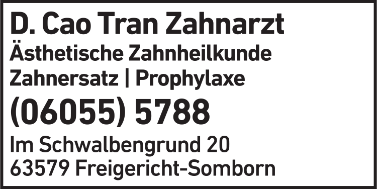 Die Adresse von Tran Dinh Cao Zahnarzt lautet: Im Schwalbengrund 20, 63579 Freigericht