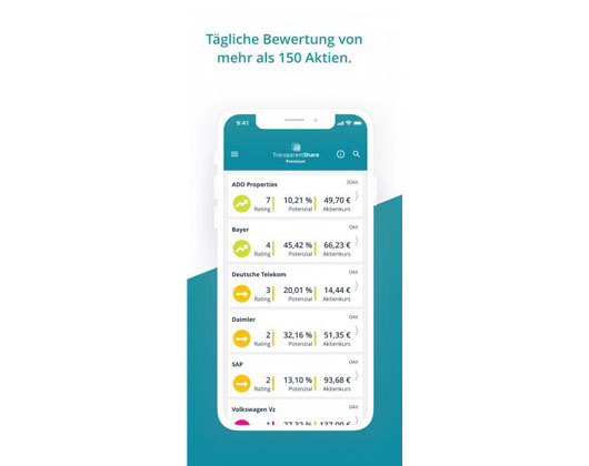 Die Aktien App TransparentShare bietet nachvollziehbare Aktienbewertung für jedermann. Mehr als 150 deutsche Aktien werden tagesaktuell ausgewertet und zum Kauf oder Verkauf empfohlen.