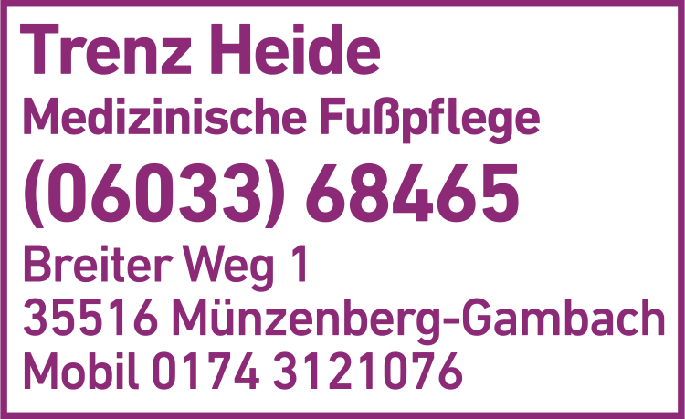 Trenz Heide Medizinische Fußpflege 06033 6 84 65 Münzenberg-Gambach Breiter Weg 1 35516 Gambach
