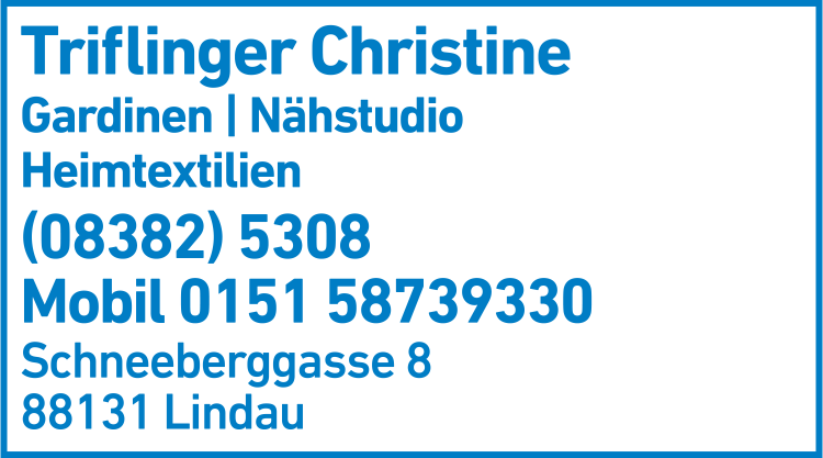Die Adresse von Triflinger Christine Gardinen, Nähstudio lautet: Schneeberggasse 8, 88131 Lindau