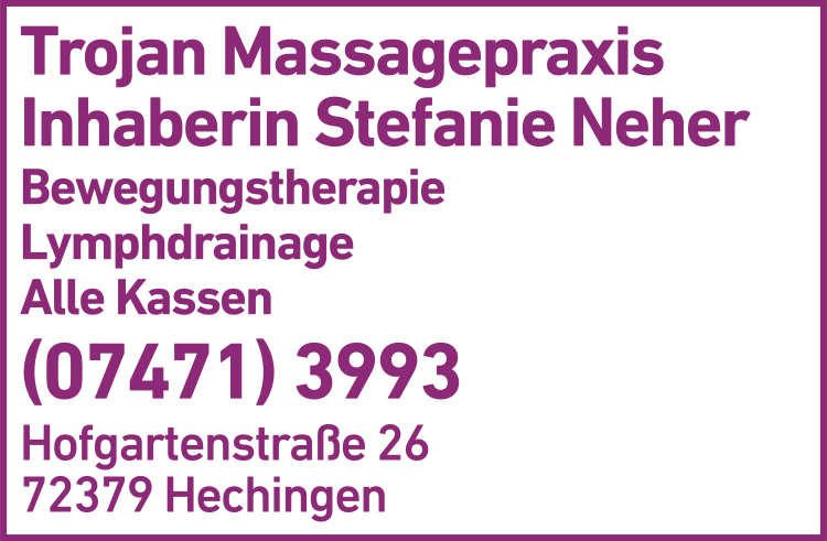 Die Adresse von Trojan Stefanie Massagepraxis, Nagelstudio lautet: Hofgartenstr. 26, 72379 Hechingen