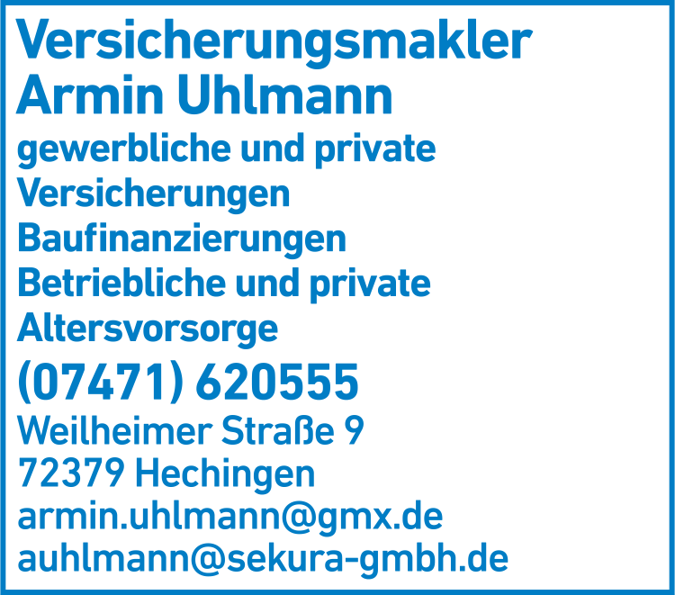 Die Adresse von Uhlmann Armin Versicherungsmakler lautet: Weilheimer Str. 9, 72379 Hechingen
