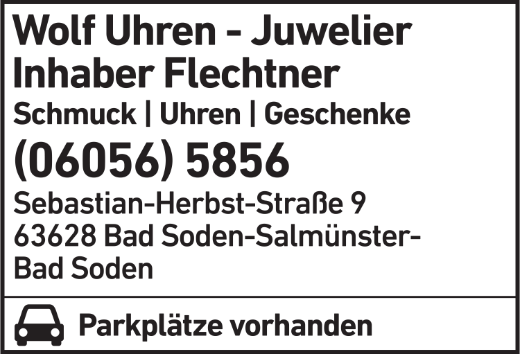 Uhren Wolf Inh. Ulla und Torsten Flechtner 06056 58 56 Bad Soden-Salmünster Sebastian-Herbst-Str. 9 63628 Bad Soden de.teleauskunft.oetb.webapp2.detail.Graphic@35fadc2f 4.5 5 2