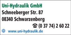 Die Adresse von Uni-Hydraulik GmbH lautet: Schneeberger Str. 87, 08340 Schwarzenberg