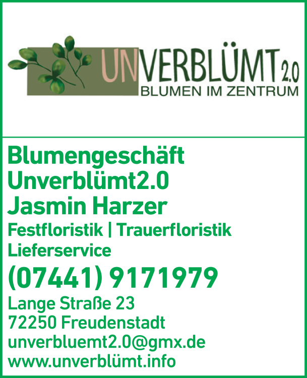 Die Adresse von Unverblümt Blumengeschäft lautet: Lange Str. 23, 72250 Freudenstadt
