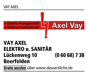 Die Adresse von VAY AXEL lautet: Lückenweg 10, 64760 Oberzent