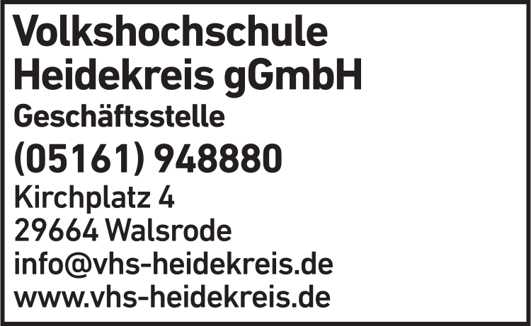 Die Adresse von VHS Heidekreis lautet: Kirchplatz 4, 29664 Walsrode