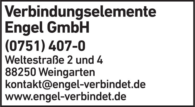 Die Adresse von Verbindungselemente Engel GmbH lautet: Weltestr. 2 u.4, 88250 Weingarten