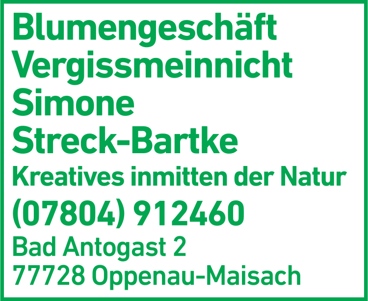 Die Adresse von Vergissmeinnicht Simone Streck Blumengeschäft lautet: Bad Antogast 2, 77728 Oppenau-Maisach
