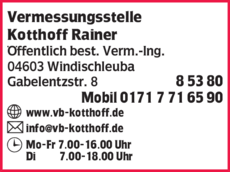 Die Adresse von Vermessungsstelle Kotthoff Rainer lautet: Gabelentzstr. 8, 04603 Windischleuba
