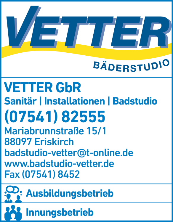 Die Adresse von Vetter GbR Badstudio lautet: Mariabrunnstr. 15/1, 88097 Eriskirch