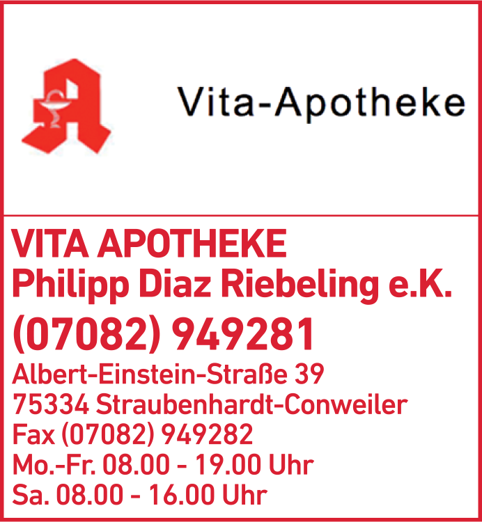 Die Adresse von Vita-Apotheke lautet: Albert-Einstein-Str. 39, 75334 Straubenhardt