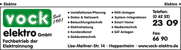 Vock elektro GmbH bietet Elektroheizung, Beleuchtung, KNX-Anlagen, Sprech- und Briefkastenanlagen, Beleuchtungstechnik und Rauchwarnmelder als Produkt(e) an