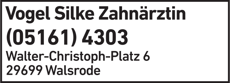 Die Adresse von Vogel Silke Zahnärztin lautet: Walter-Christoph-Platz 6, 29699 Walsrode