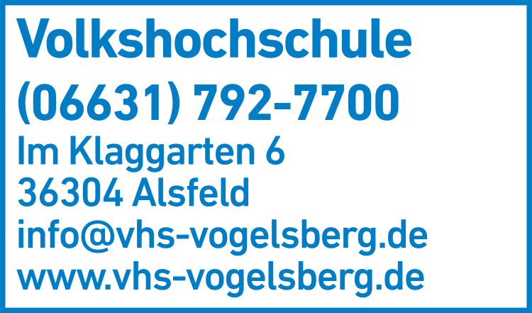 Die Adresse von Vogelsbergkreis VHS lautet: Im Klaggarten 6, 36304 Alsfeld