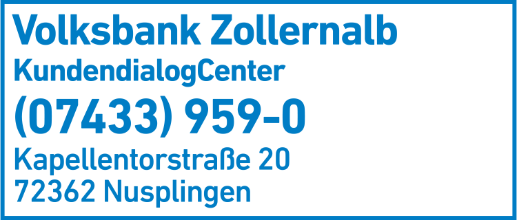 Die Adresse von Volksbank Zollernalb lautet: Kapellentorstr. 20, 72362 Nusplingen