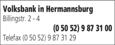 Volksbank eG Südheide-Isenhagener Land-Altmark 05052 9 87 31 00 Hermannsburg Billingstr. 2- 4 29320 Hermannsburg